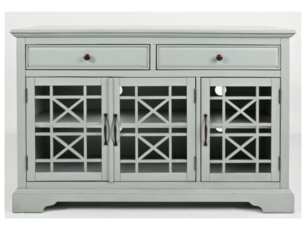 This 50” media and storage unit features an uniquely distressed finish with two drawers and three glass doors. With “X”