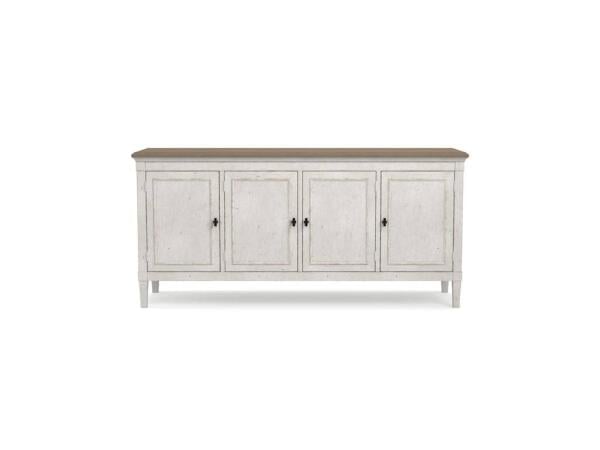 Our Bella 72″ Entertainment Credenza in Aged Whitestone finish combines storage space with old world style. The doors feature bar