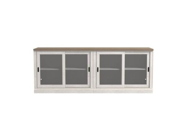 Our Bella 80″ Credenza in Aged Whitestone finish combines storage and display space with old world style. The glass front