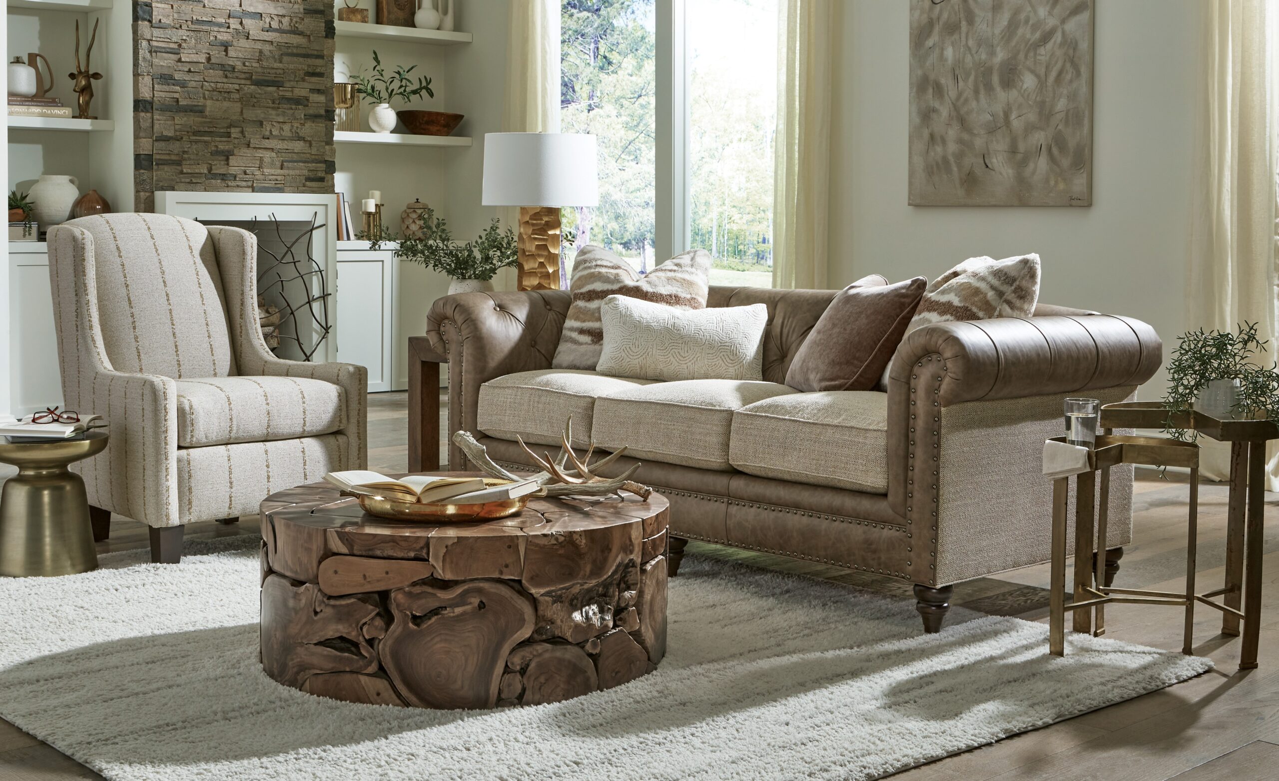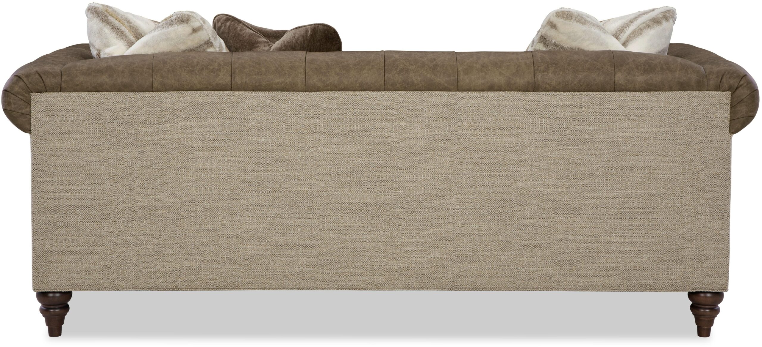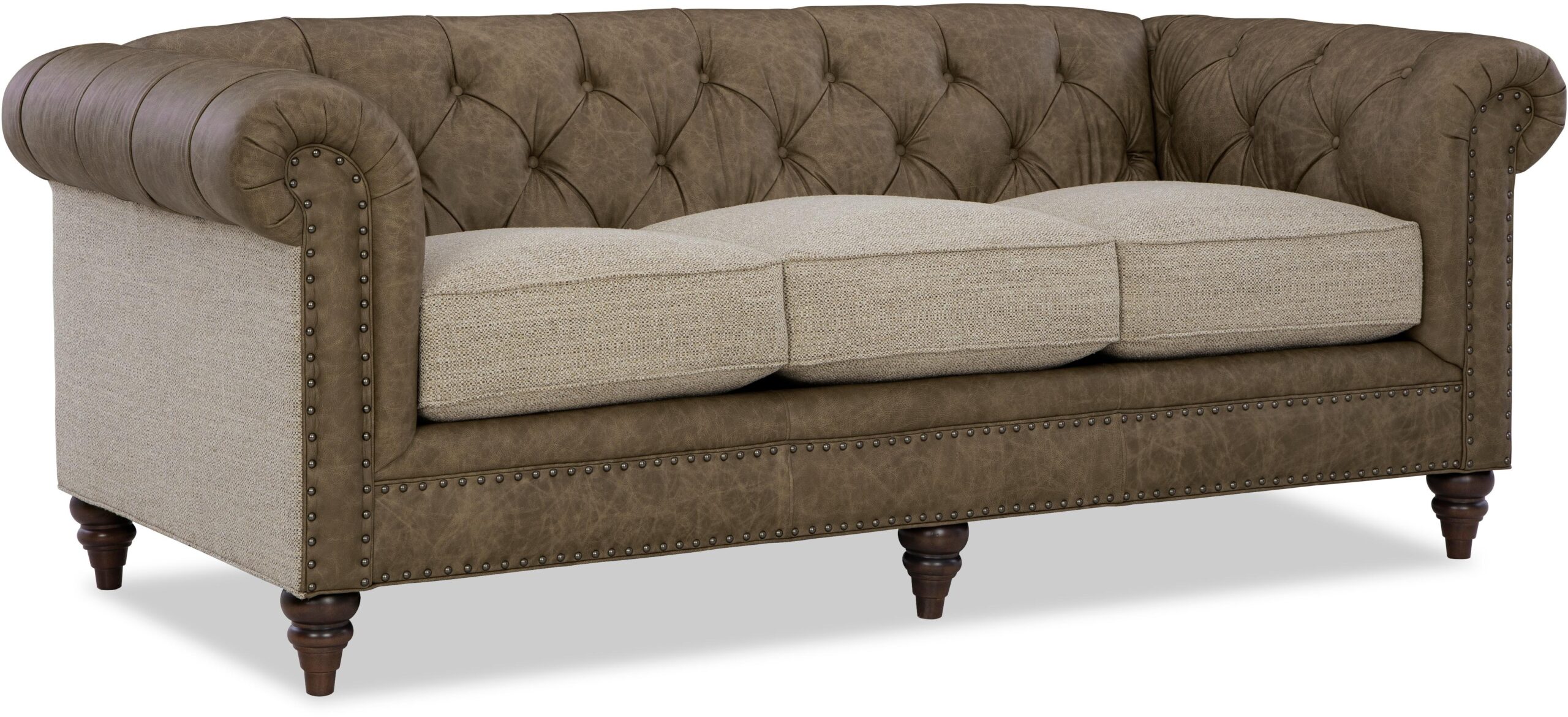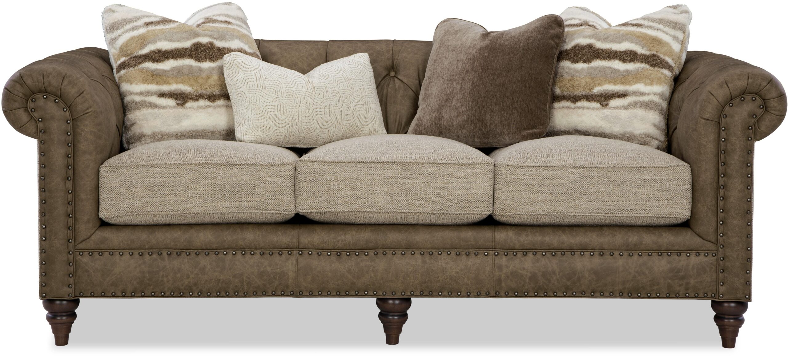 Casual luxury and sophisticated styling meld together to bring a modern update to this classic Chesterfield sofa. Covered in both leather and fabric, it has a unique blended look that can be fully customized with any fabric and leather in our line. (see the Custom Blends order form for details about how to order this). It features handcrafted elements like the tall turned legs and nail head trim, as well as a unique assortment of 4 Luxdown toss pillows for a custom look. Comfort is key with deep leather tufting on the back and arms and three plush Blend Down Coil seat cushions. Two lengths available- 99” and 88”. Also available are the matching loveseat, chair 1/2 and ottoman. Also available without nail head trim. To order in all leather, see style L7431. To order in all fabric, see style 7431.