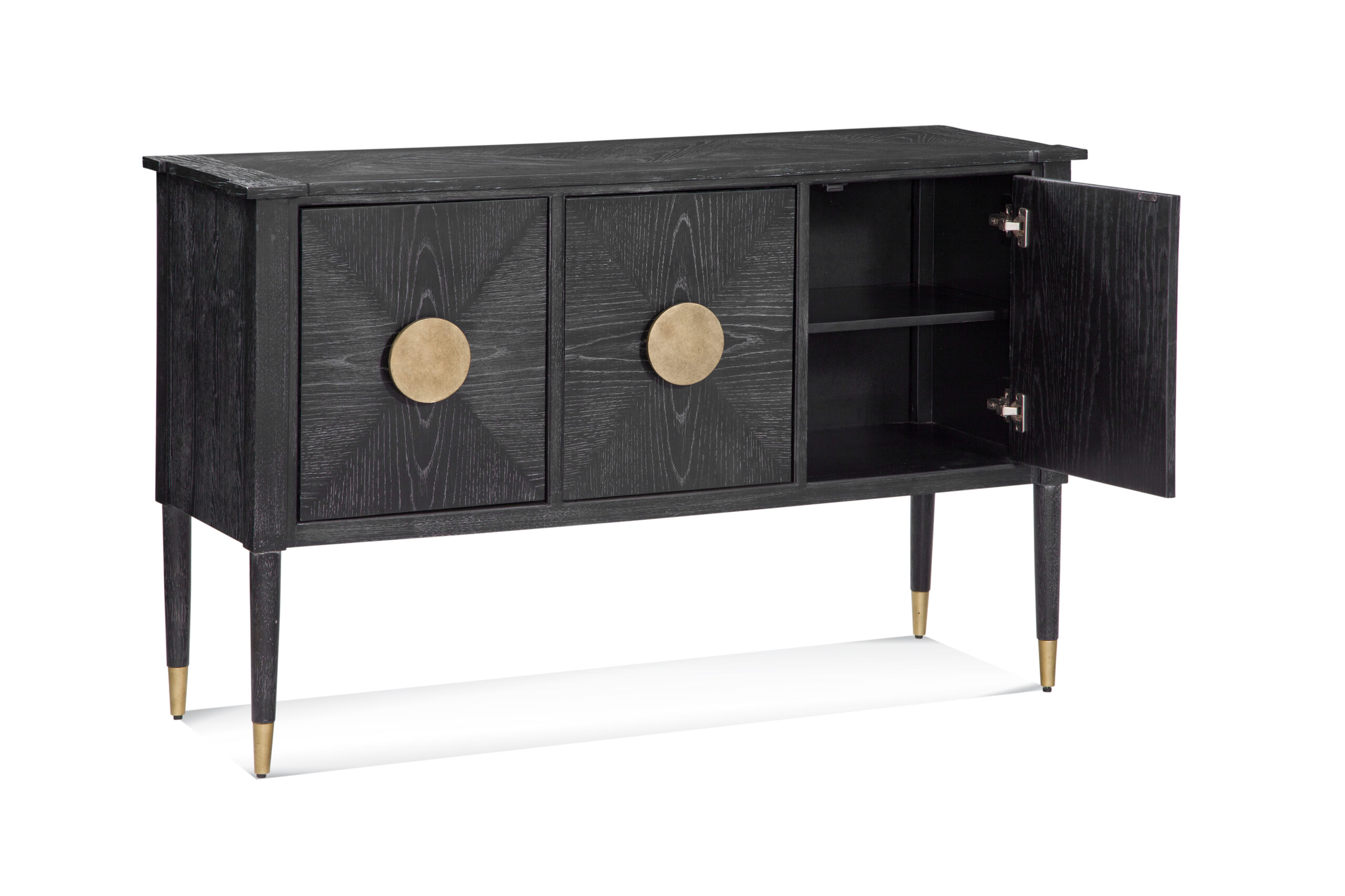 The Jensen Console table brings a modern glam style to the home. Constructed with rubberwood solids and flat-cut, cerused oak finished in a black stain. The open grain finish features generous white wax hang-up. The dark wood is accented with hand-padded gold leaf finished panels and hardware, which tie back to the bronze finished foot caps on each piece. This server features three doors with a single adjustable shelf behind each providing ample storage.